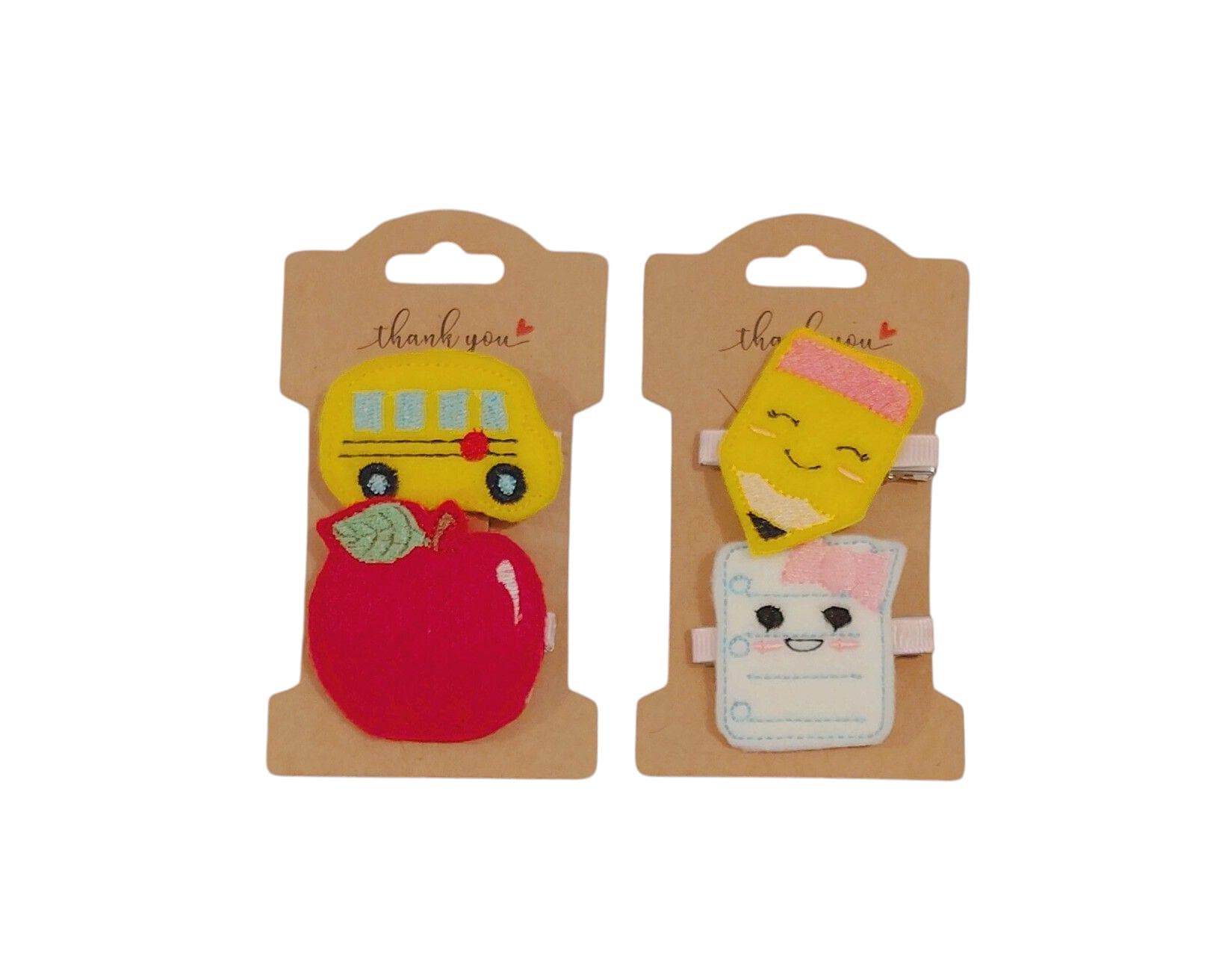 Handmade in my home sewing studio. Embroidered felties on 1.75" gross grain ribbon lined hairclip.