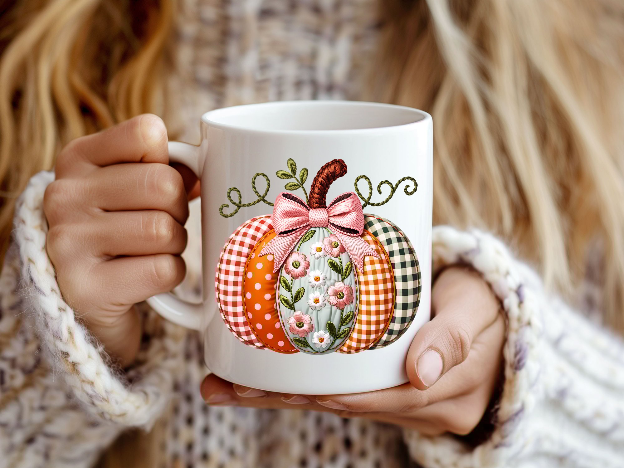 15 oz coffee mug with a cute faux embroidered pumpkin. Will become your favorite mug all Autumn long.